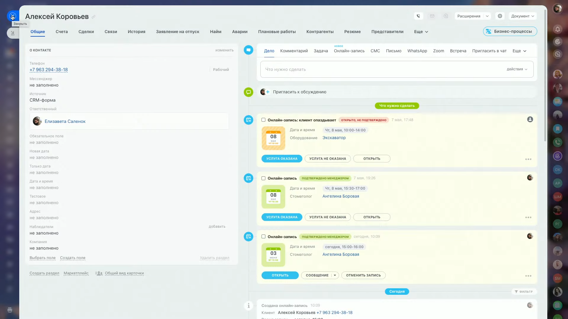 В Битрикс24 вы можете записывать клиентов на услуги прямо из карточки CRM. Все данные о записи автоматически сохраняются и в разделе онлайн-записи, и в карточке клиента.